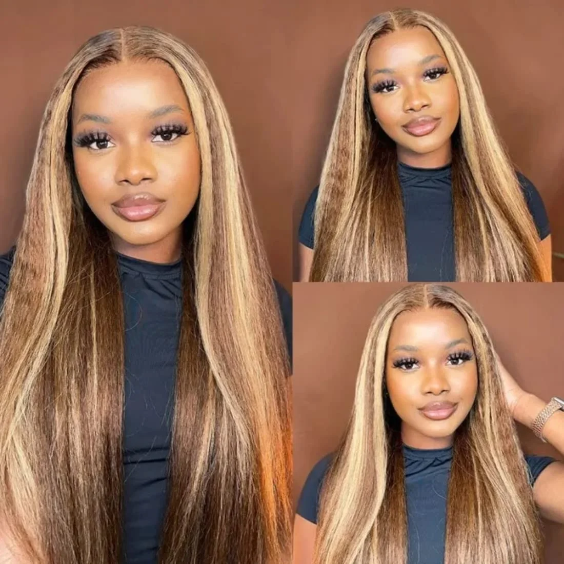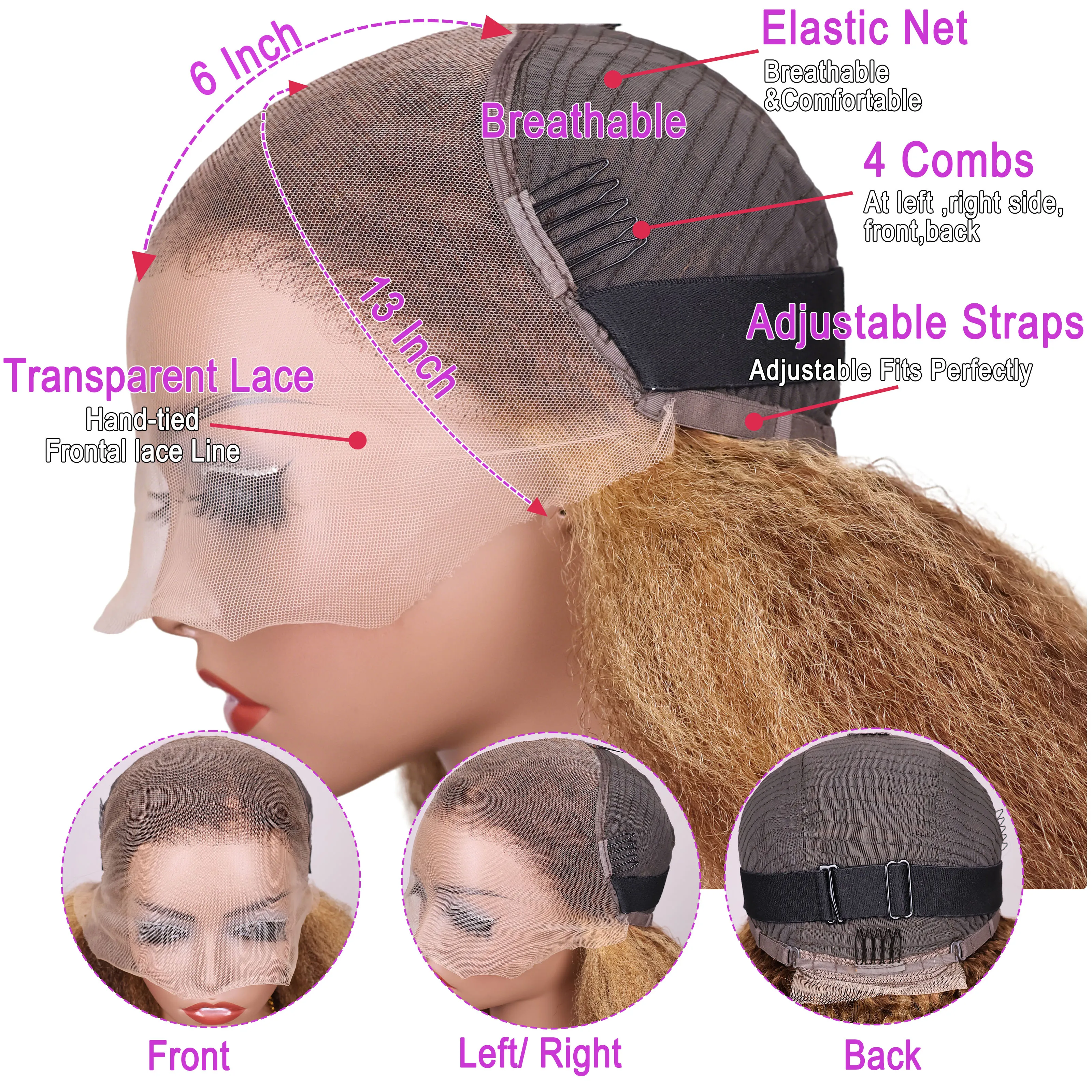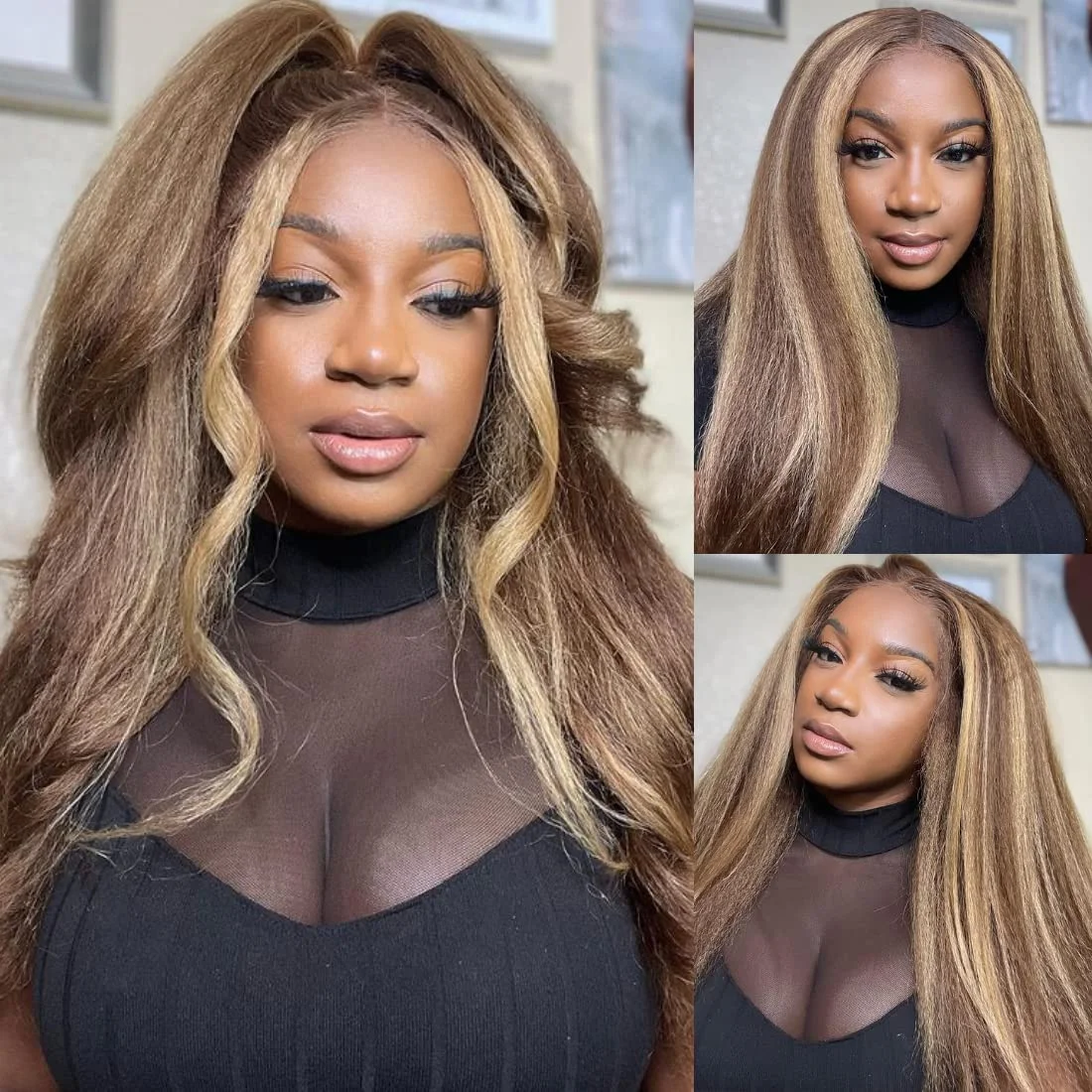 4/27 Kinky Straight 13x6 Lace Frontal Human Hair Wigs For Women Blonde Brown Piano Color 13x4 Lace Front Wig PrePlucked Yaki Wig