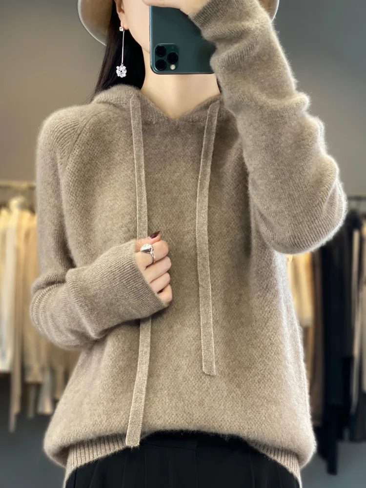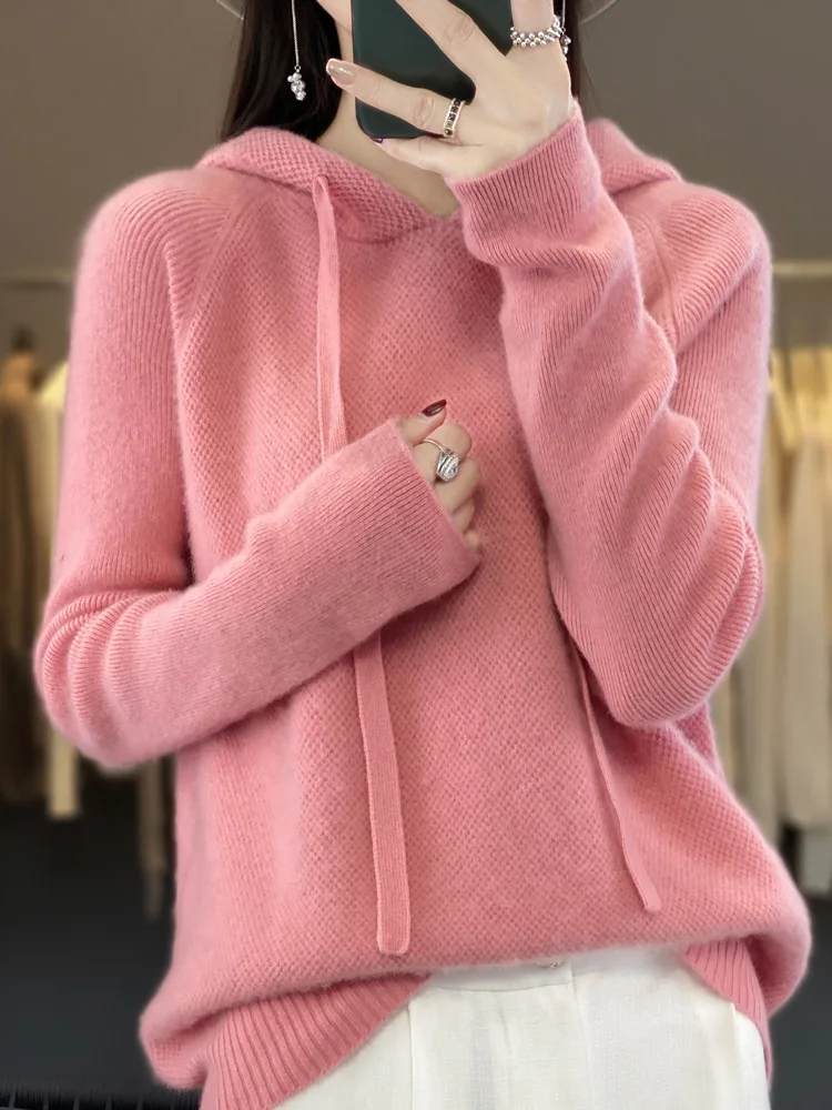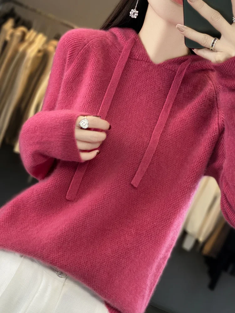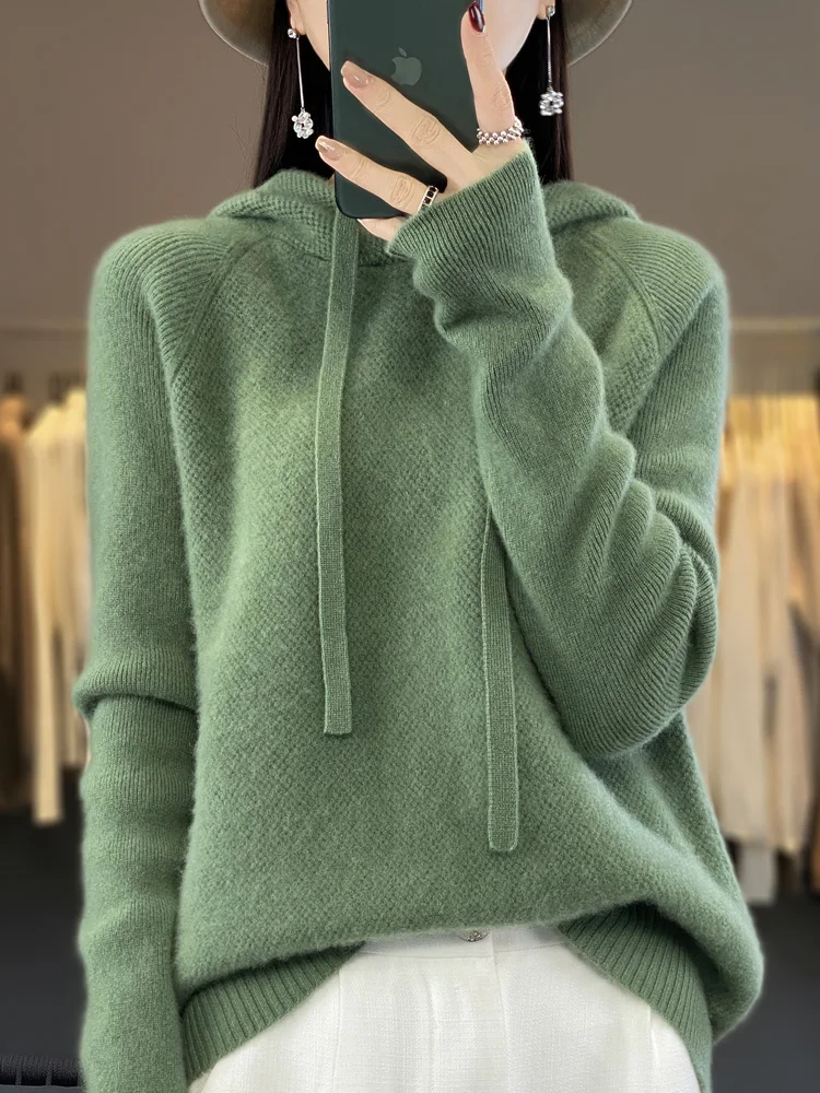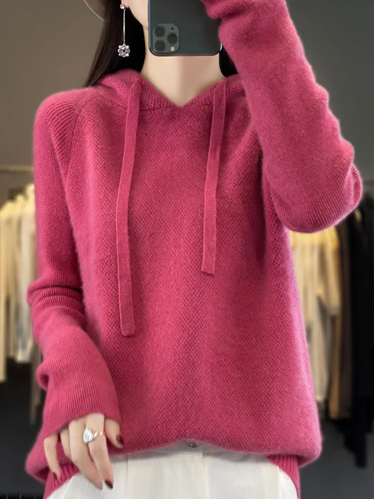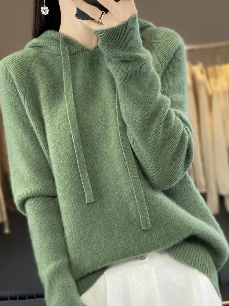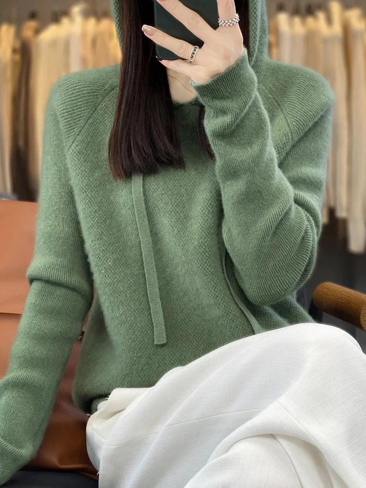 Autumn Winter Women's Cashmere Hooded Pullover Thick Sweater Raglan Sleeve 100% Merino Wool Knitwear Warm Casual Comfortable Top