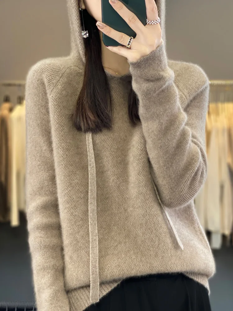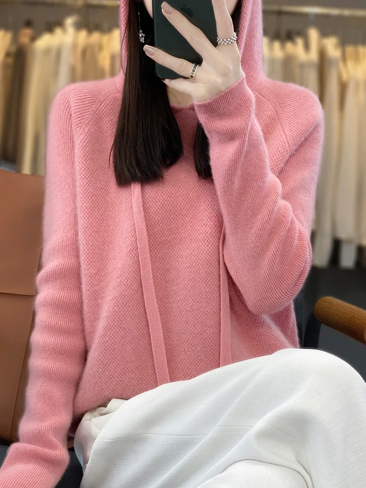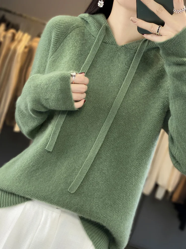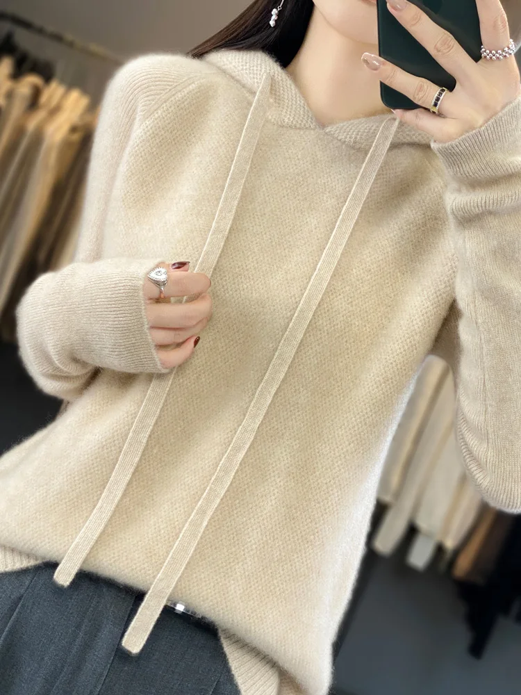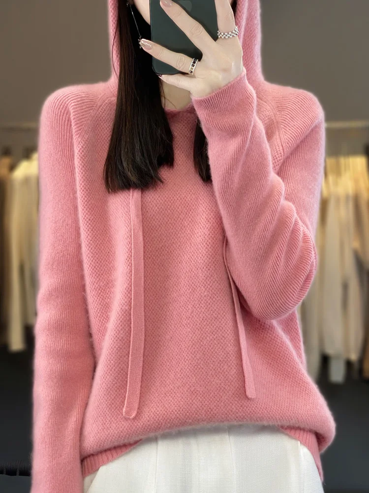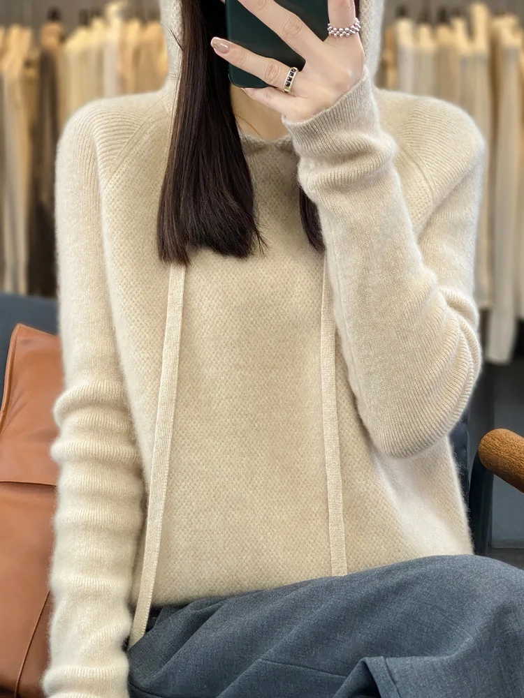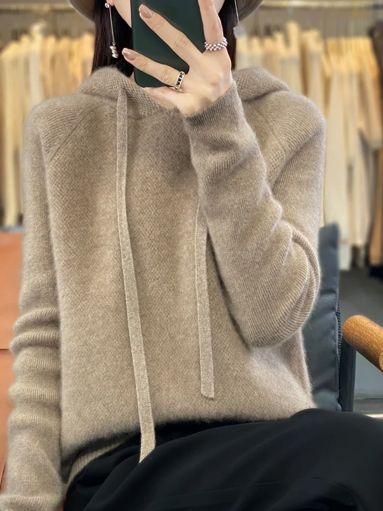 Autumn Winter Women's Cashmere Hooded Pullover Thick Sweater Raglan Sleeve 100% Merino Wool Knitwear Warm Casual Comfortable Top