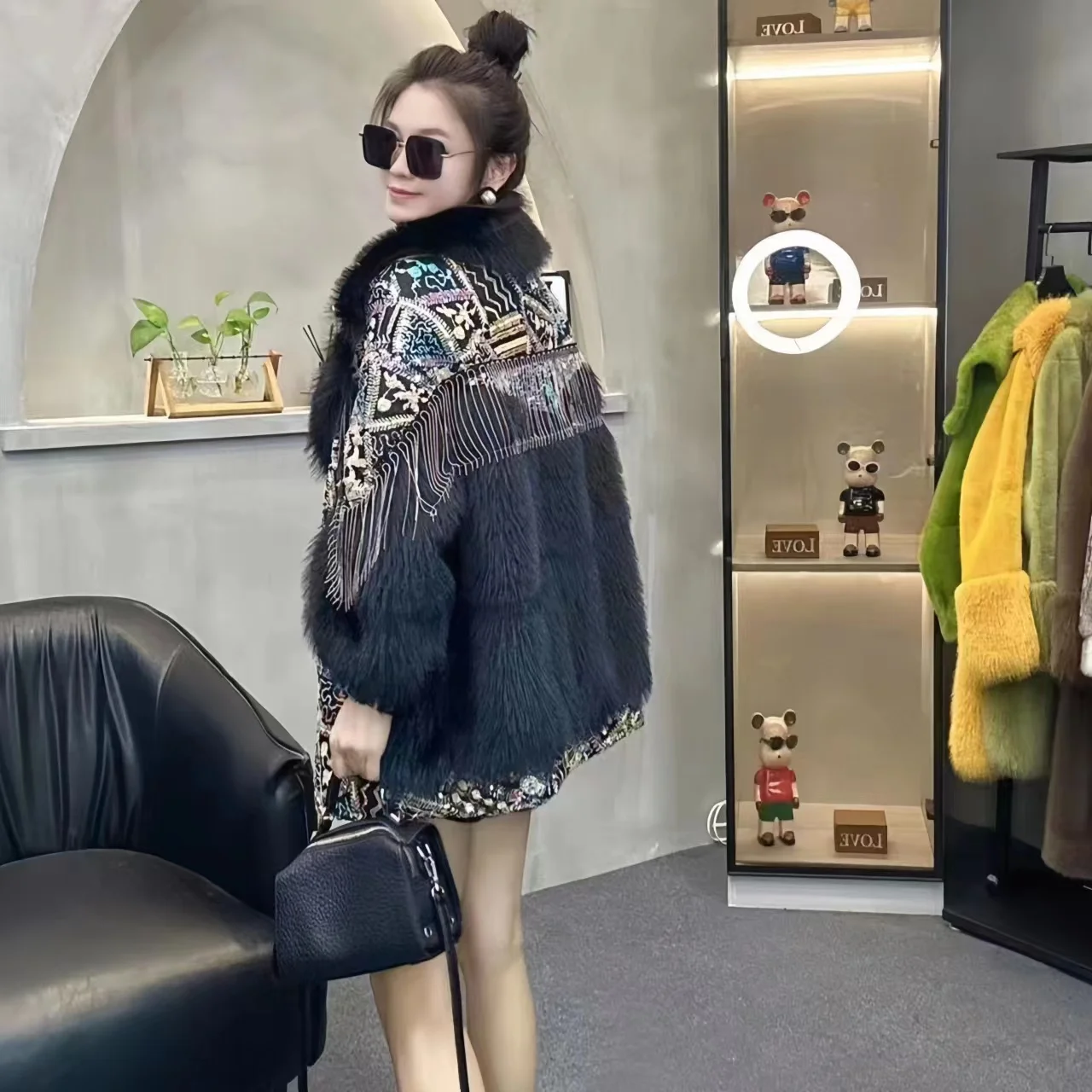 Faux Fur Coat for Women,Spliced Jacket, Chalns Vcoat, Loose and Thicken Warm Coat, High Quality, Female Winter, New, 202