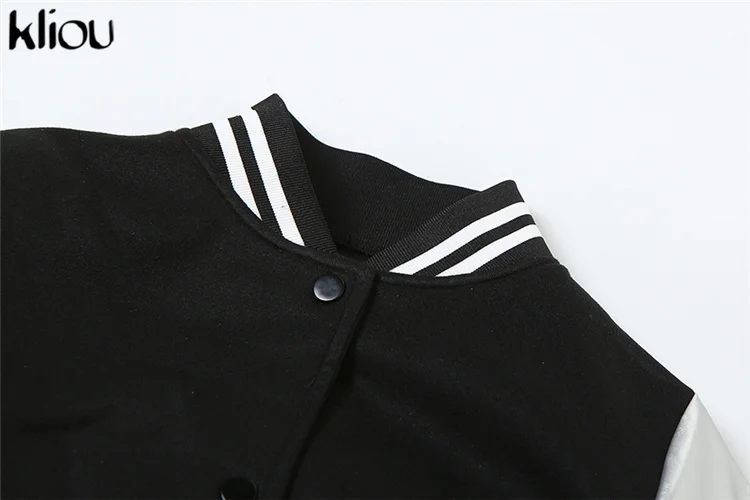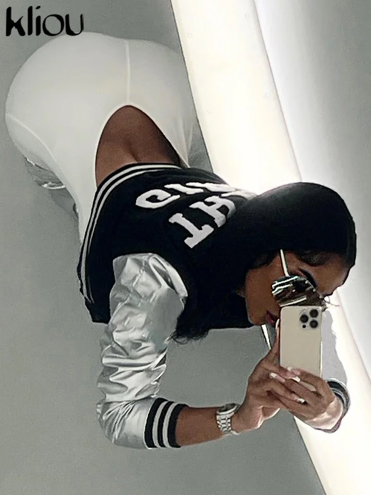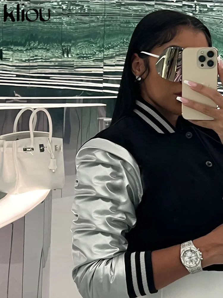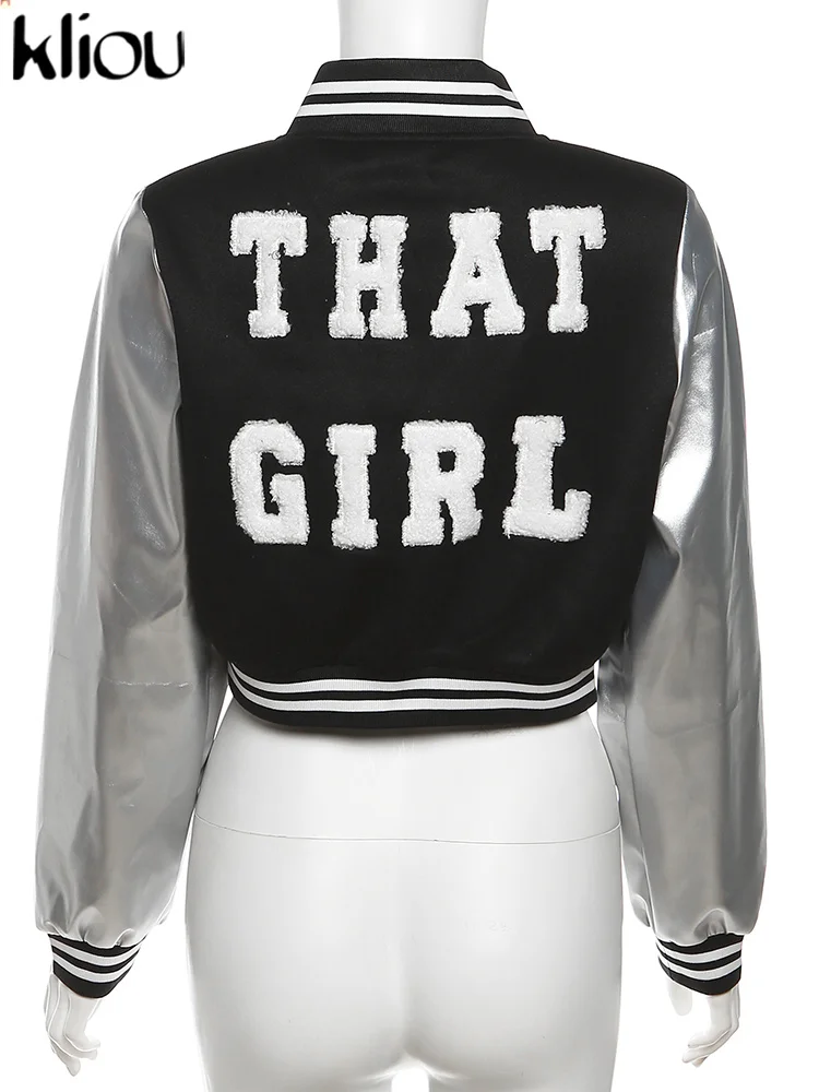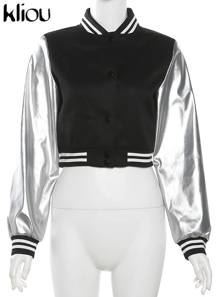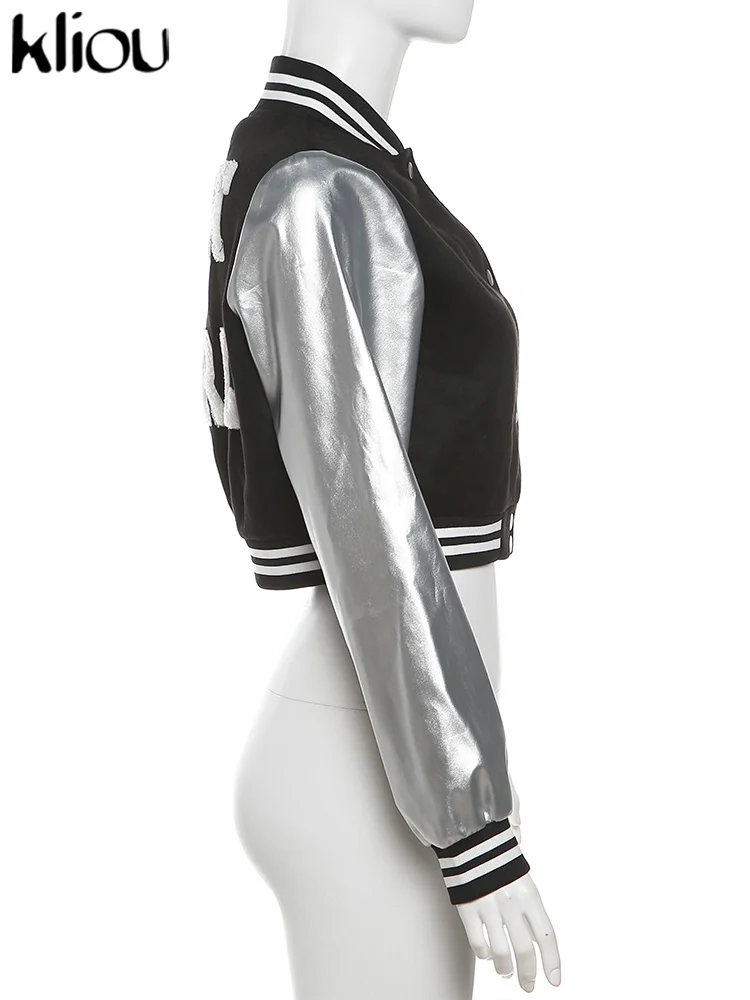 Kliou Letter Shape Patchwork Coats Women Casual Classic Panelled Long Sleeve Single Breasted Croped Jacket Female Street Outwear