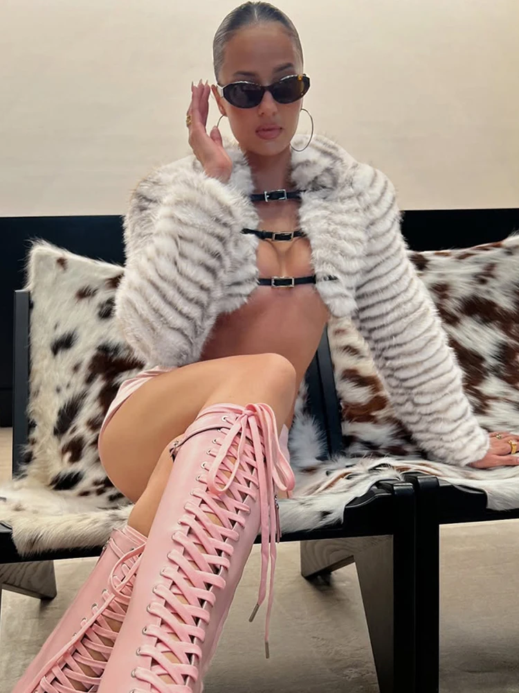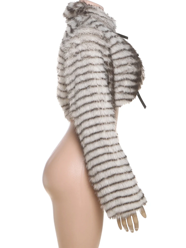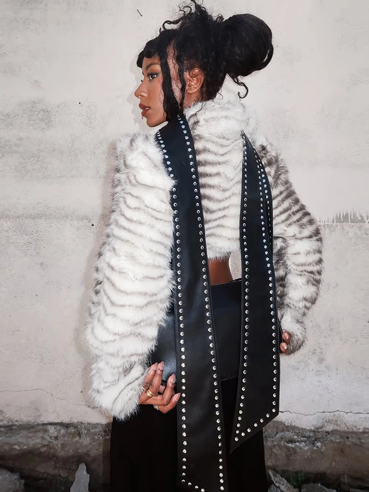 Kliou Sexy Fashion Crop Jacket Woman Autumn Trend Furry Warm Style Belt Metal Buckle Cardigan Full Sleeve High Street Jacket