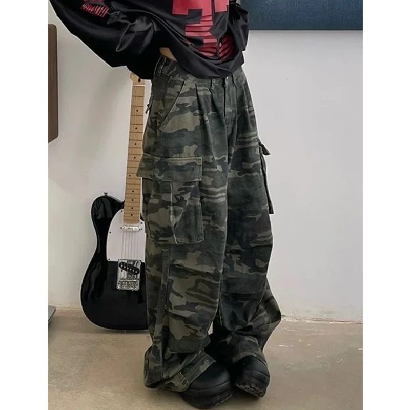 Military Green Womens Jeans High Waist Vintage Straight Baggy Y2K Denim Pants Hip Hop American Fashion Wide Leg Denim Trouser