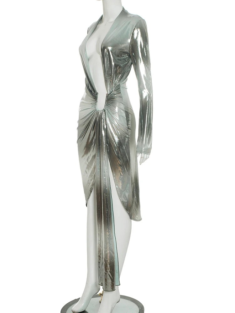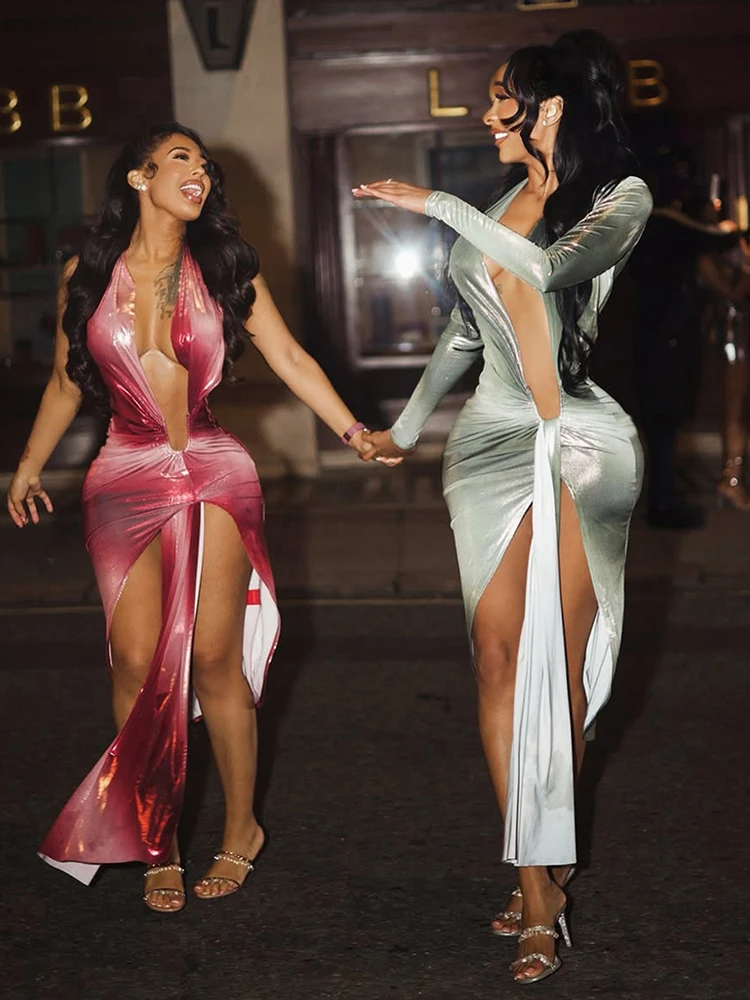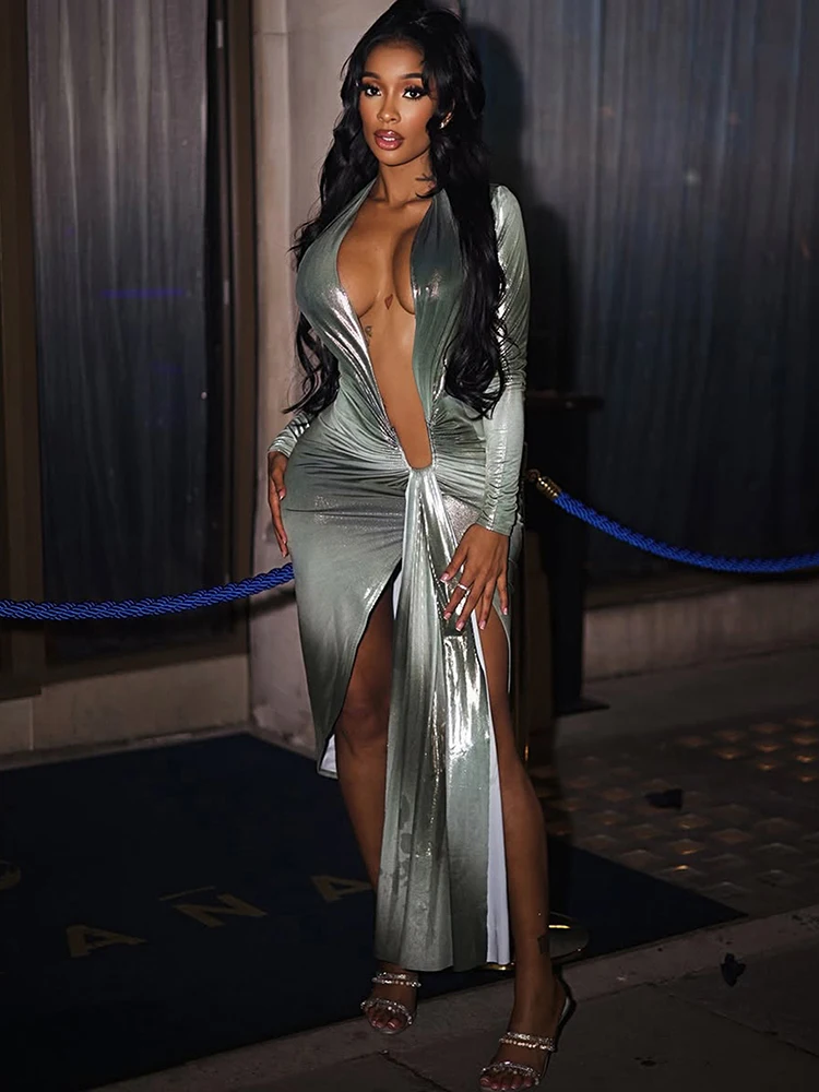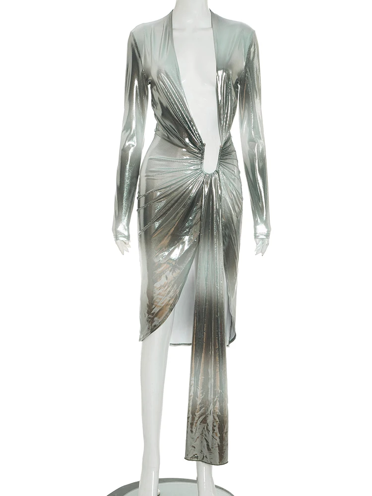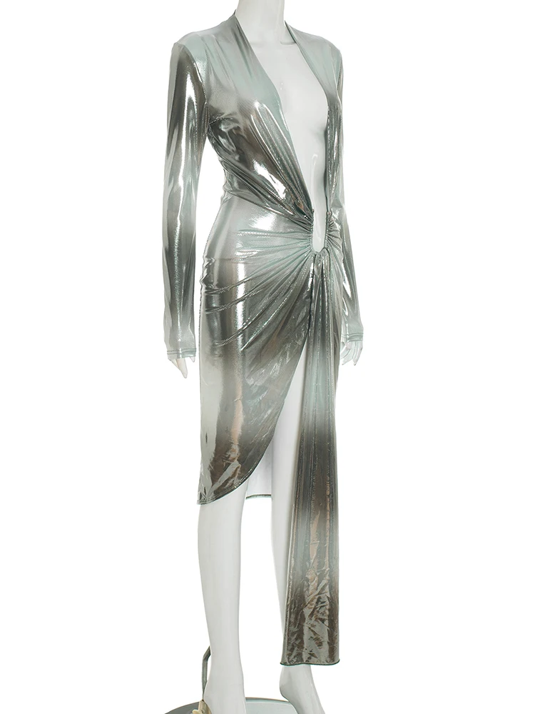 Weird Puss Sexy Silky Split Dress Women Irregular Ribbon Gradient Color Deep V-Neck Coquette Hottie Street Elegant Slim Bodycon
