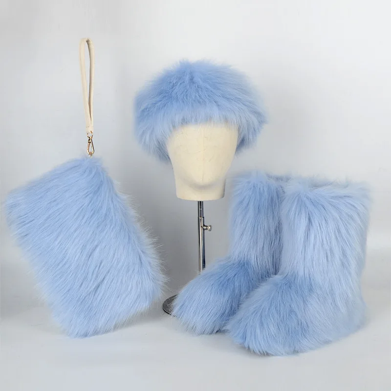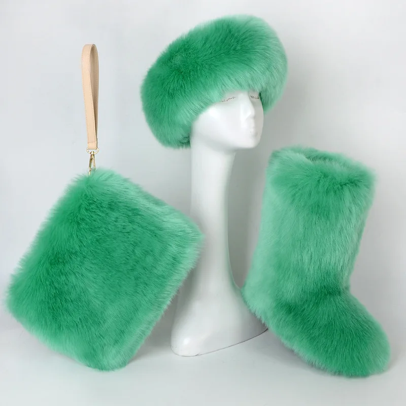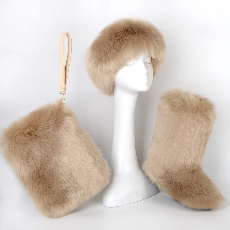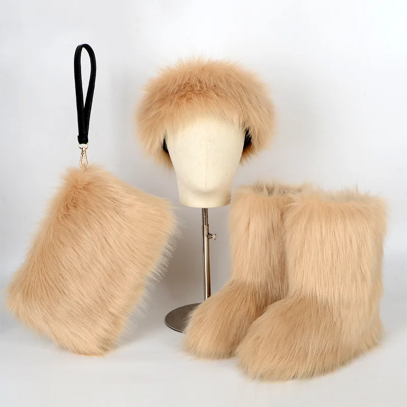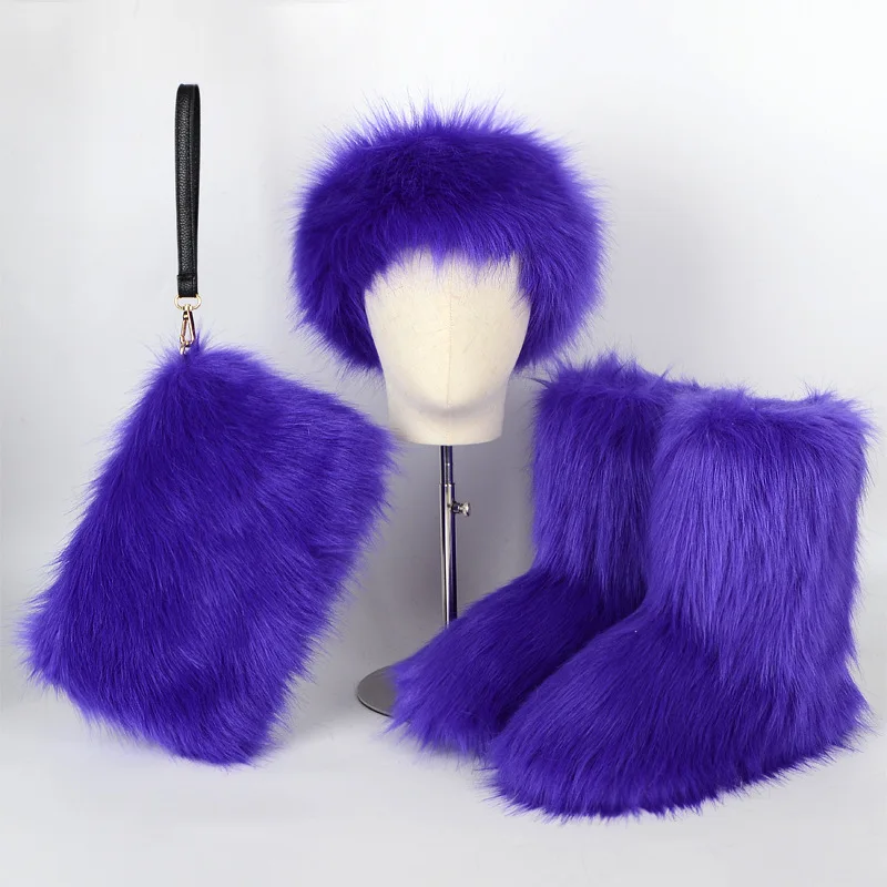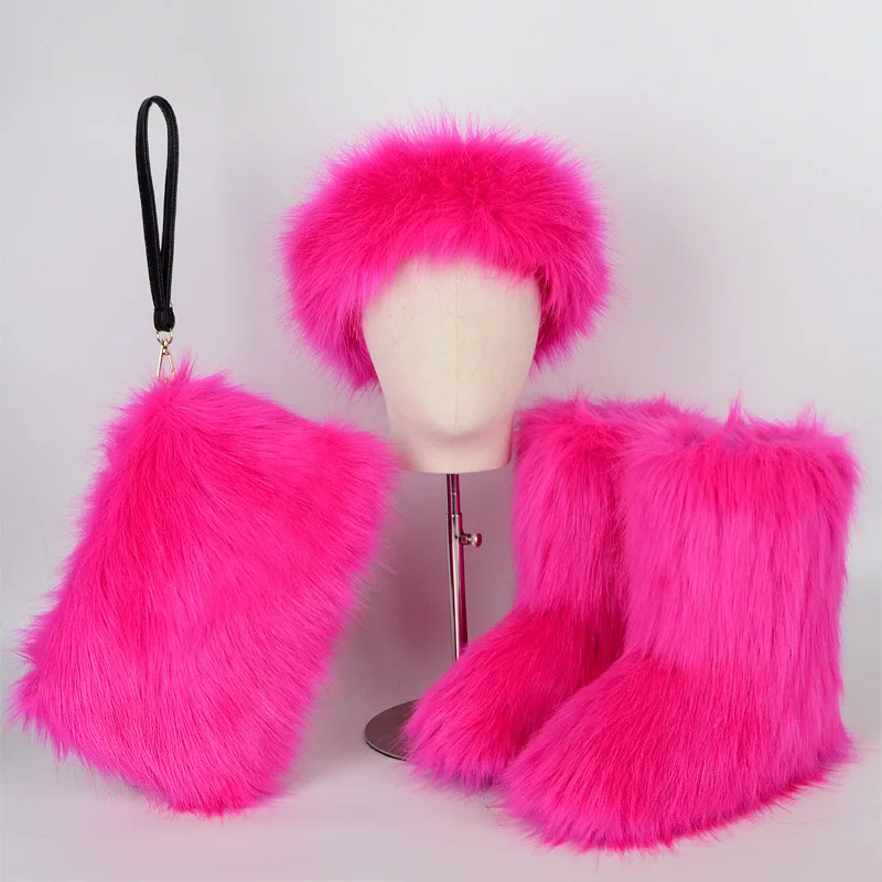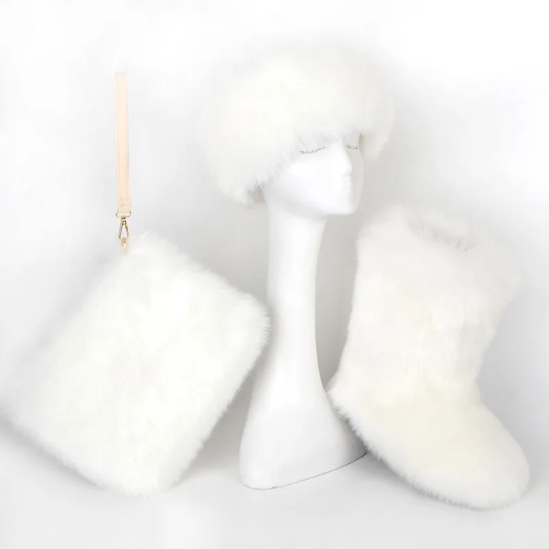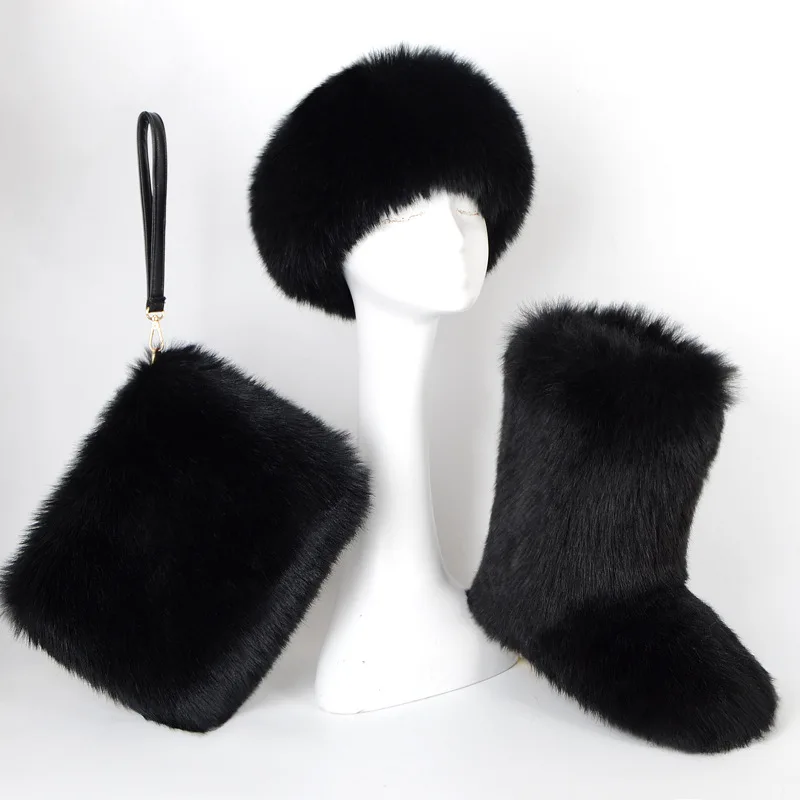 Women High Quality Fur Snow Boots One Fur Plus Velvet Thick Plus Size Snow Boots Headband Clutch Bag Imitation Fox Fur Boots Set