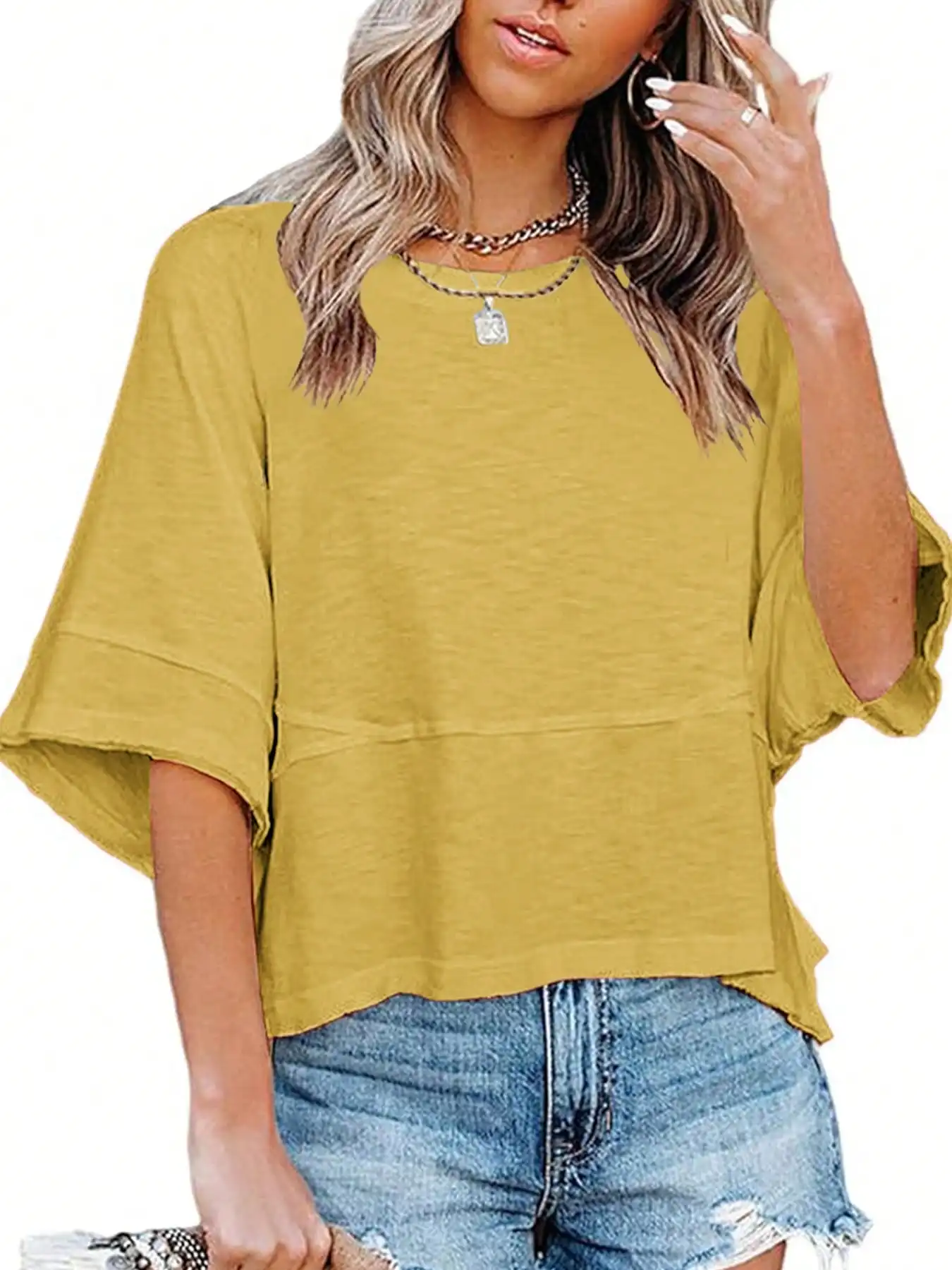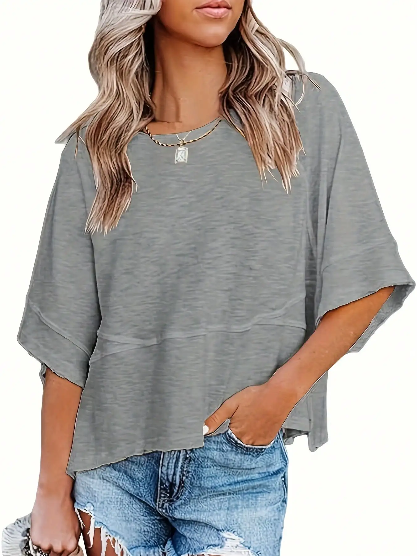 Women's Summer New Crewneck Batwing Half Sleeve Tops Solid Color Loose Fit Cute Flowy Tee Shirts Casual Dressy Cropped Blouse